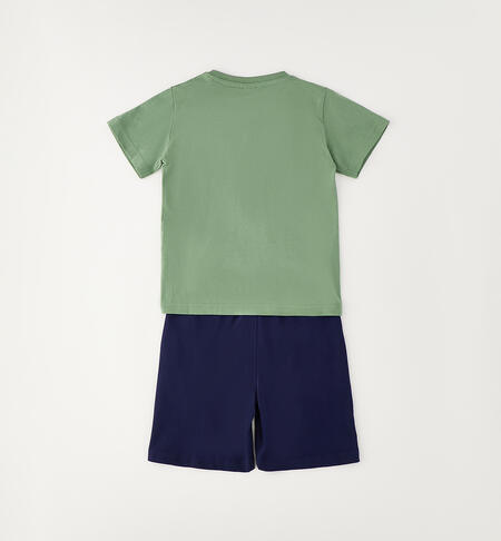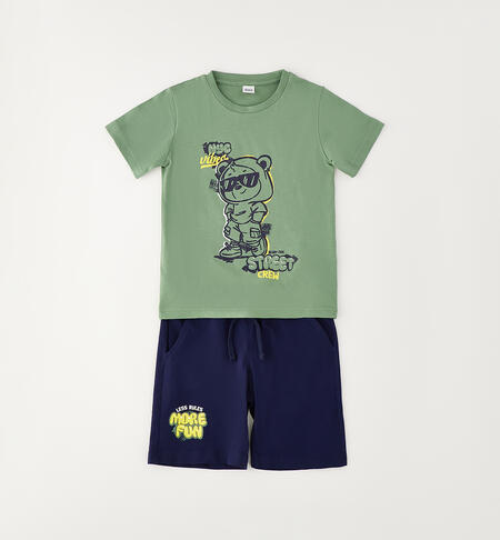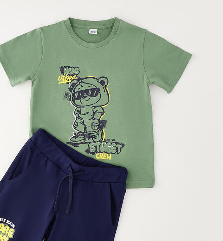 Completo estivo per bambino iDO realizzato in jersey 100% cotone. T-shirt con stampa e pantalone corto al ginocchio. Elastico in vita con coulisse.