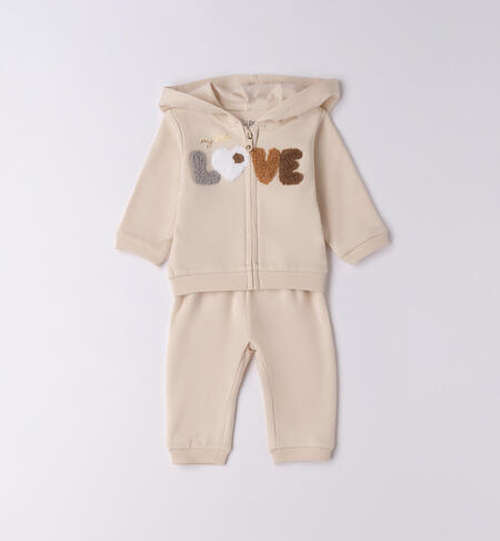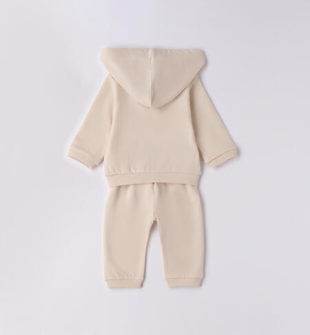 Tuta neonata iDO 1-24 mesi realizzata in tessuto di felpa stretch di cotone, pesantezza invernale. Il modello è composto da felpa e pantalone. La felpa presenta apertura davanti con zip ed è arricchita da cappuccio, stampa laminata e ricamo. Il pantalone ha vita elasticizzata e polsini sul fondo gamba.