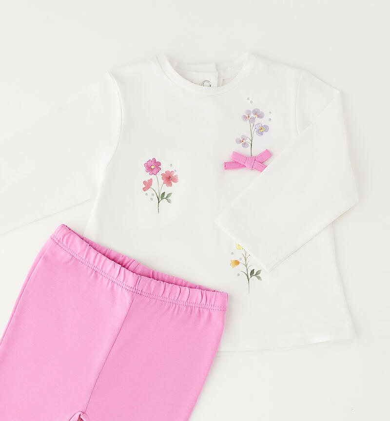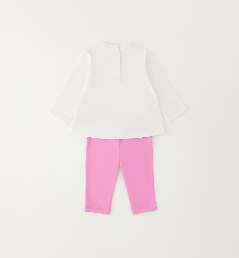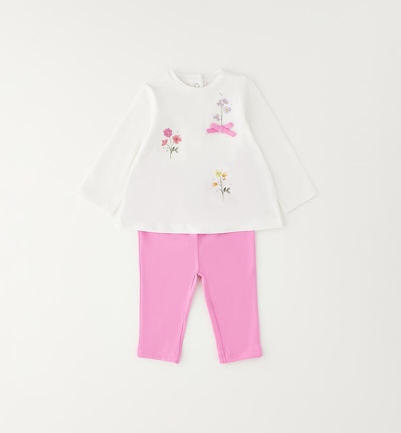 Completo per neonata Minibanda realizzato in jersey stretch di cotone. Maglietta a manica lunga con stampa, ricamo e piccoli fiocchi in applicazione. Apertura dietro con bottoni a pressione. Leggings con elastico in vita