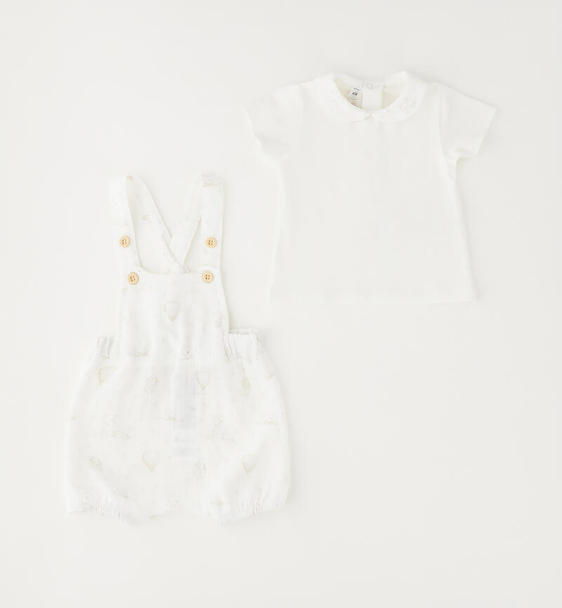 Completo manica corta Minibanda per neonati, modello unisex. T-shirt realizzata in jersey stretch di cotone con apertura dietro tramite bottoni a pressione. Salopette in muslin con fantasia all over e bretelle regolabili