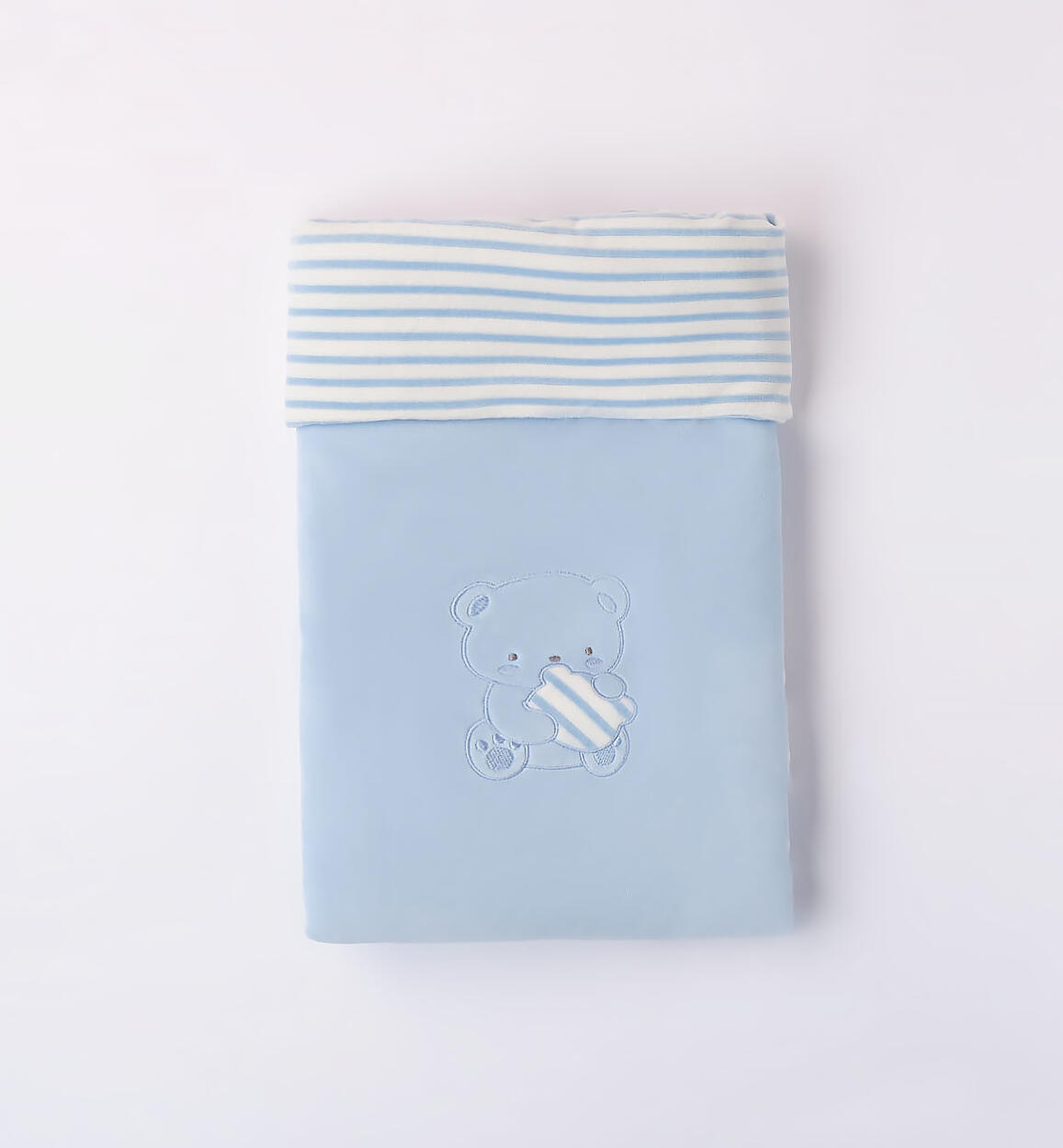 Copertina Minibanda per neonati, modello unisex, realizzata in ciniglia con imbottitura in ovatta. Davanti è arricchita da ricamo in applicazione. Misure culla: 60 cm x 80 cm