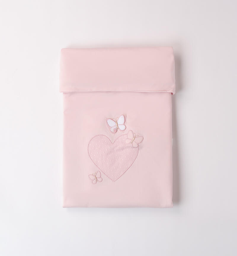 Copertina per neonata Minibanda in jersey stretch di cotone, con imbottitura in ovatta. Il modello presenta fantasia tinta unita con farfalle in applicazione. La copertina รจ adatta alla culla: dimensioni 80 x 60 cm.