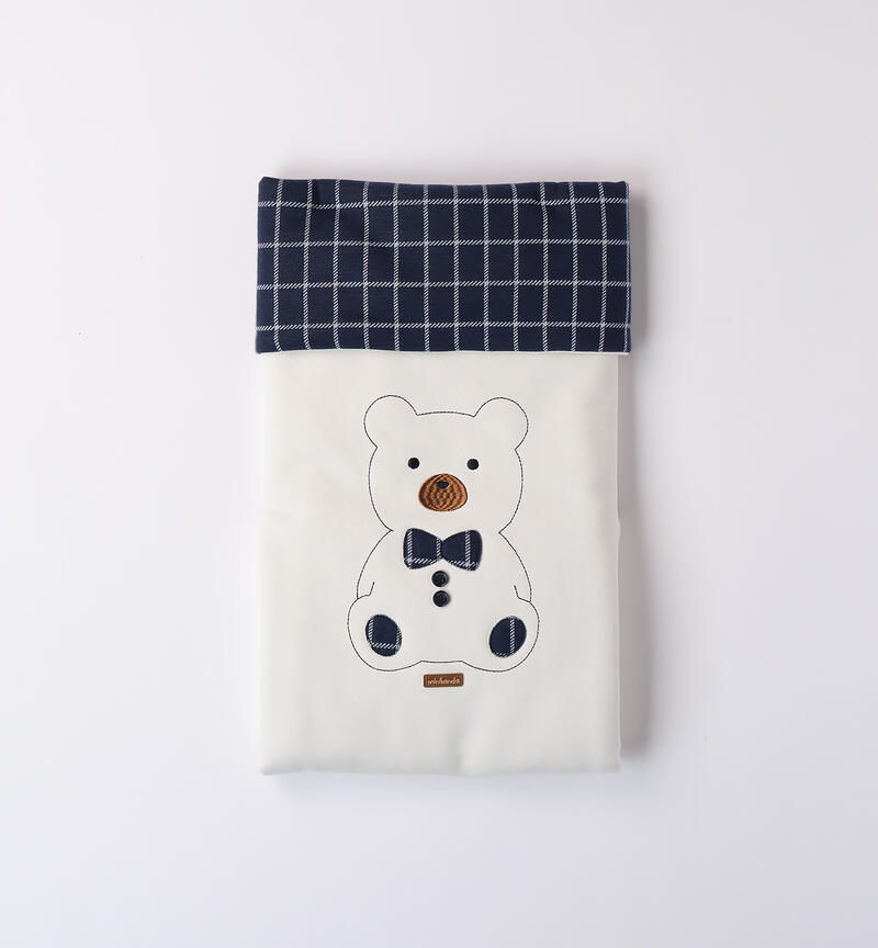 Copertina per neonato Minibanda in jacquard e felpa. Imbottitura in ovatta. Un lato ha fantasia a quadri e davanti è arricchito da ricamo orso. La copertina è adatta alla culla: dimensioni 80 x 60 cm.