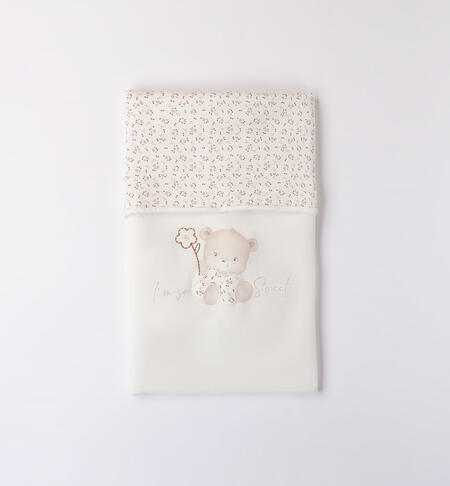Copertina per neonata iDO realizzata in jersey stretch di cotone. Il modello presenta fantasia all over di cuori e stampa di orsetto con ricamo fiore. Imbottitura in ovatta. Perfetto come idea regalo o per completare il Corredino neonata della futura nascitura. Altezza 100 cm e larghezza 75 cm