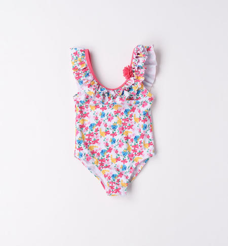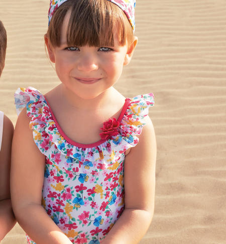 Costume intero per bambina con stampa all over di fiorellini. Il modello è arricchito da balza arricciata