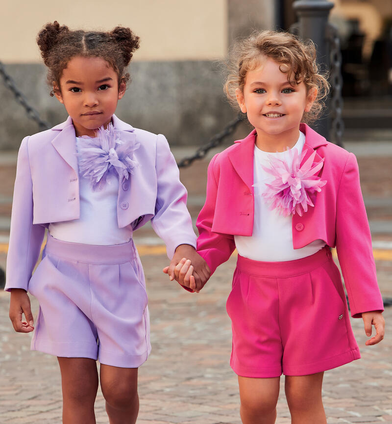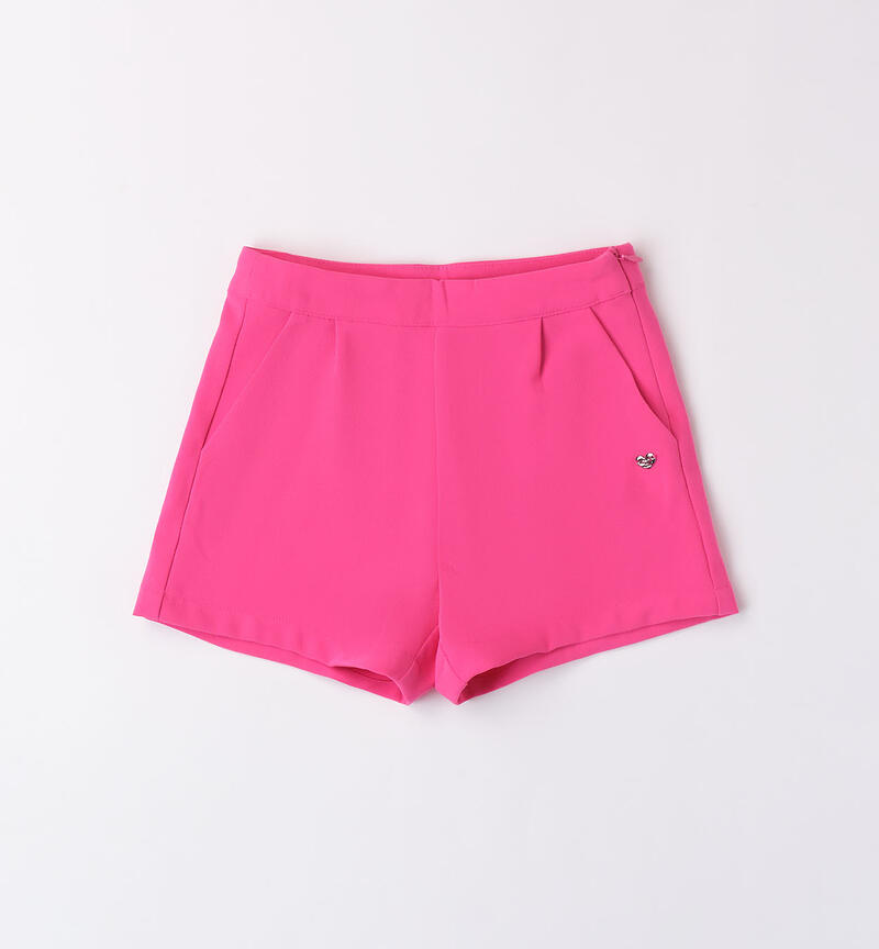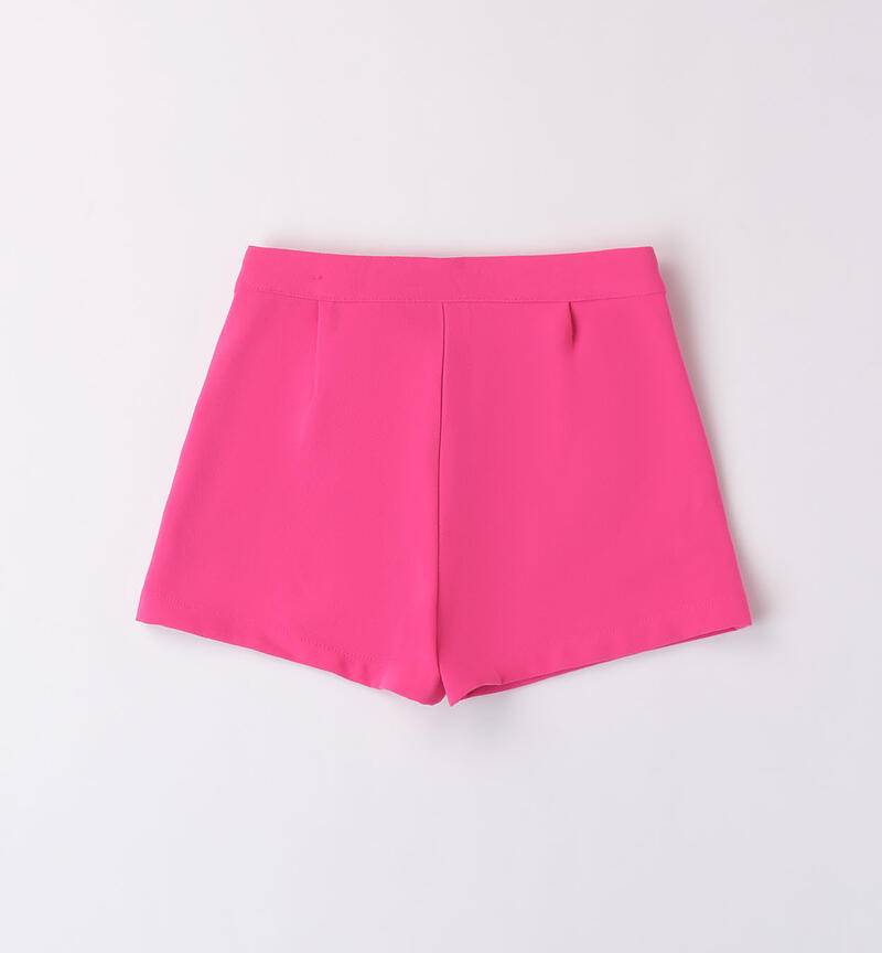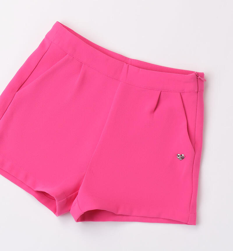 Pantalone corto per bambina Sarabanda realizzato in tessuto crepe. Il modello presenta vita elasticizzata e tasche modello chino. Misura vita regolabile con elastico asolato interno. Apertura laterale con zip invisibile