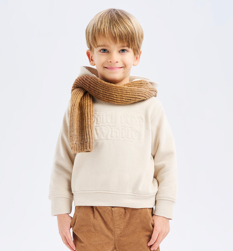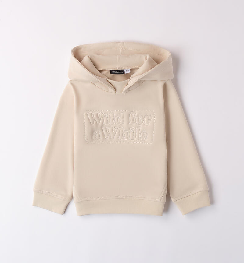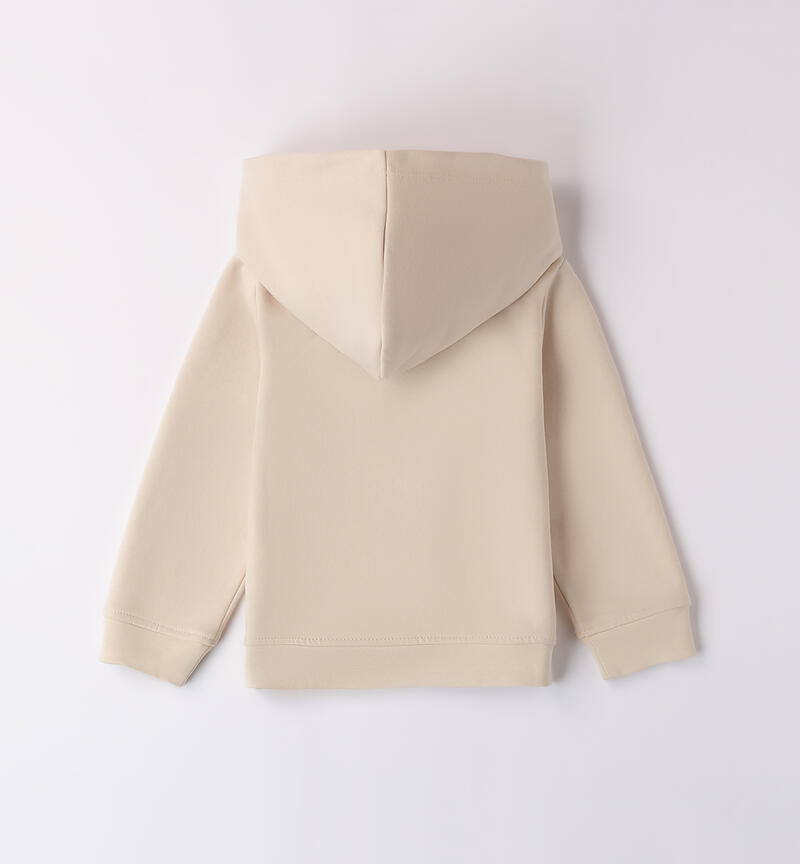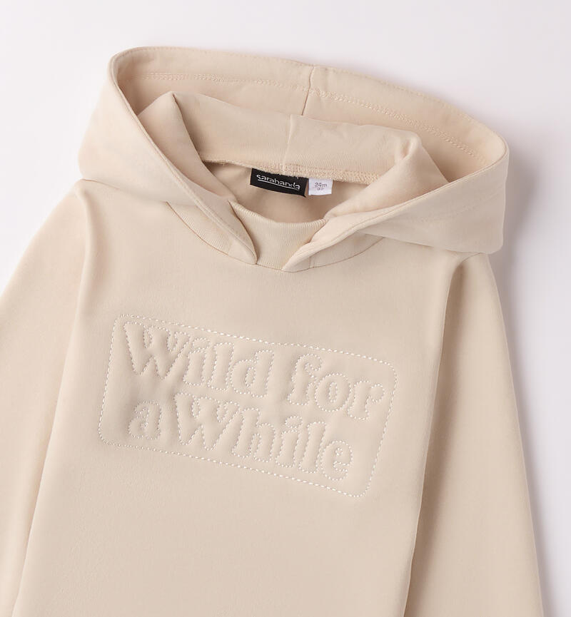 Felpa per bambino Sarabanda 9 mesi – 8 anni realizzata in tessuto felpato. Il modello è dotato di comodo cappuccio con polsini sul fondo e sulle maniche e scritta frontale. La felpa è in fantasia tinta unita.