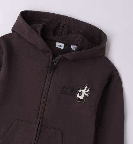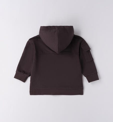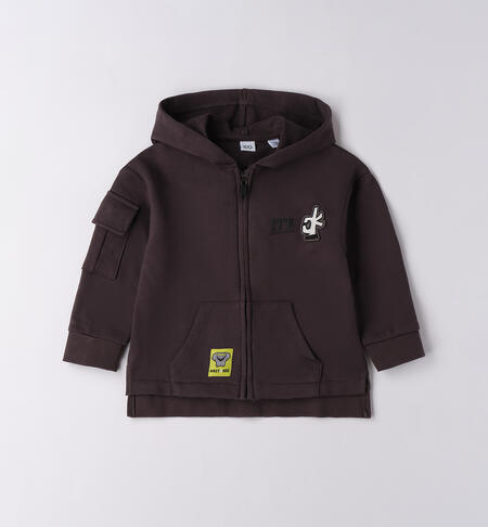 Felpa per bambino iDO realizzata in felpa autunnale. Il modello presenta apertura frontale con zip, comodo cappuccio, tasche laterali. Spalla calata, vestibilitร over.