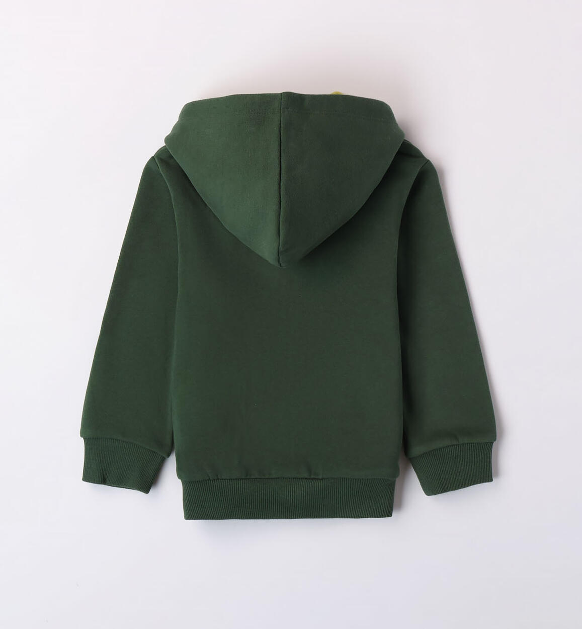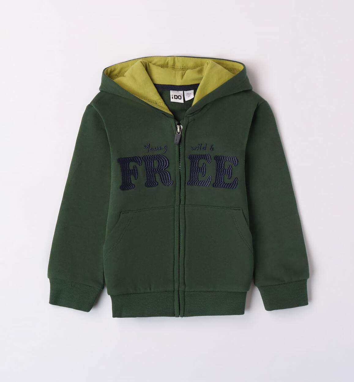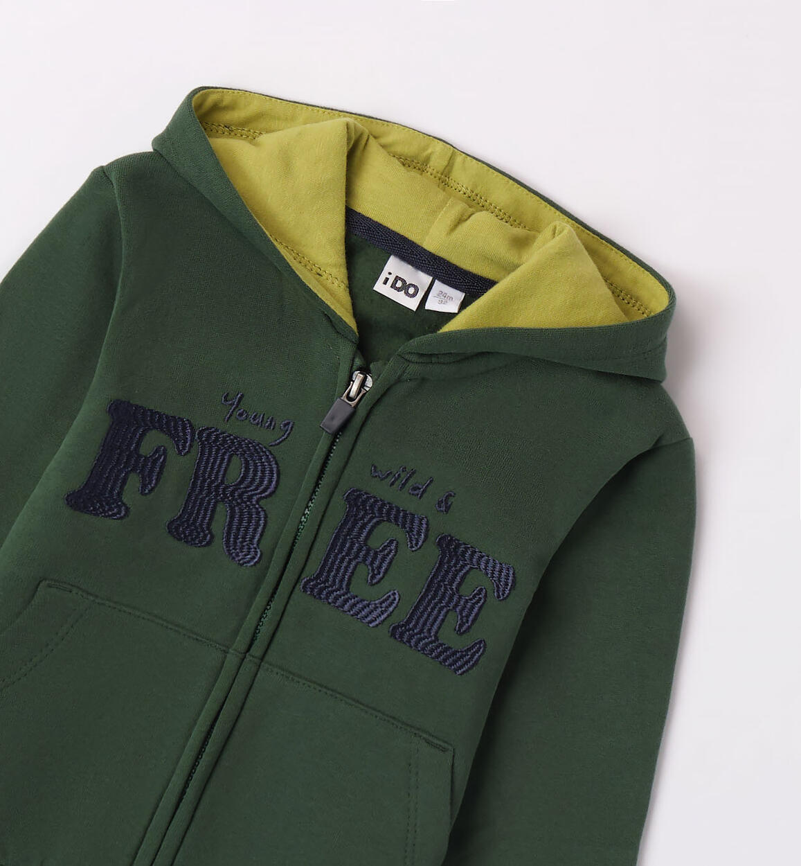 Felpa bambino IDo realizzato in felpa 100% cotone felpato, ideale per l’inverno. Il modello ha il cappuccio, tasca a marsupio e apertura con la zip.