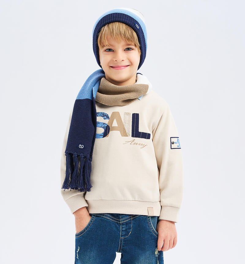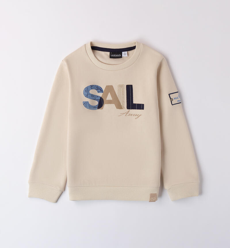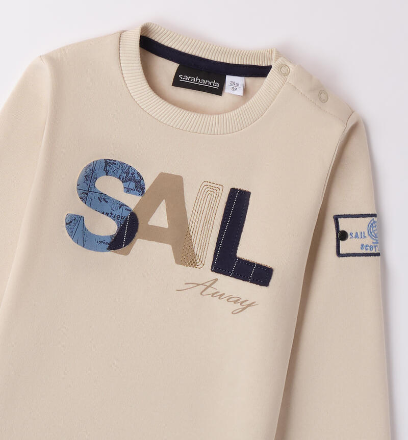 Felpa per bambino Sarabanda 9 mesi – 8 anni realizzata in tessuto felpato. Il modello è girocollo con polsini sul fondo e sulle maniche e scritta frontale. La felpa è in fantasia tinta unita.