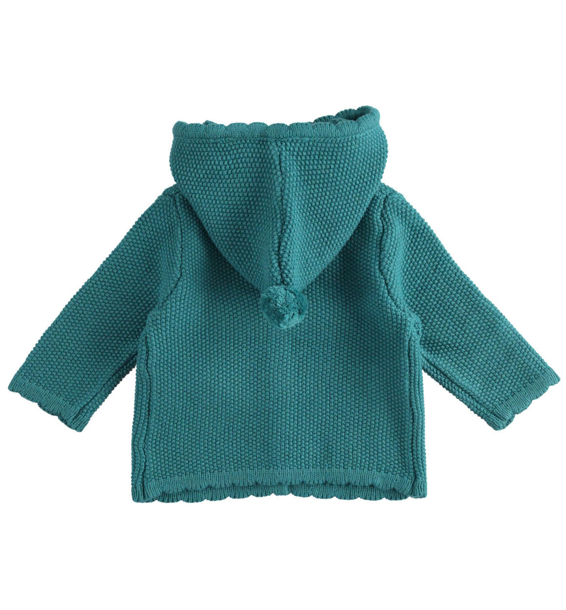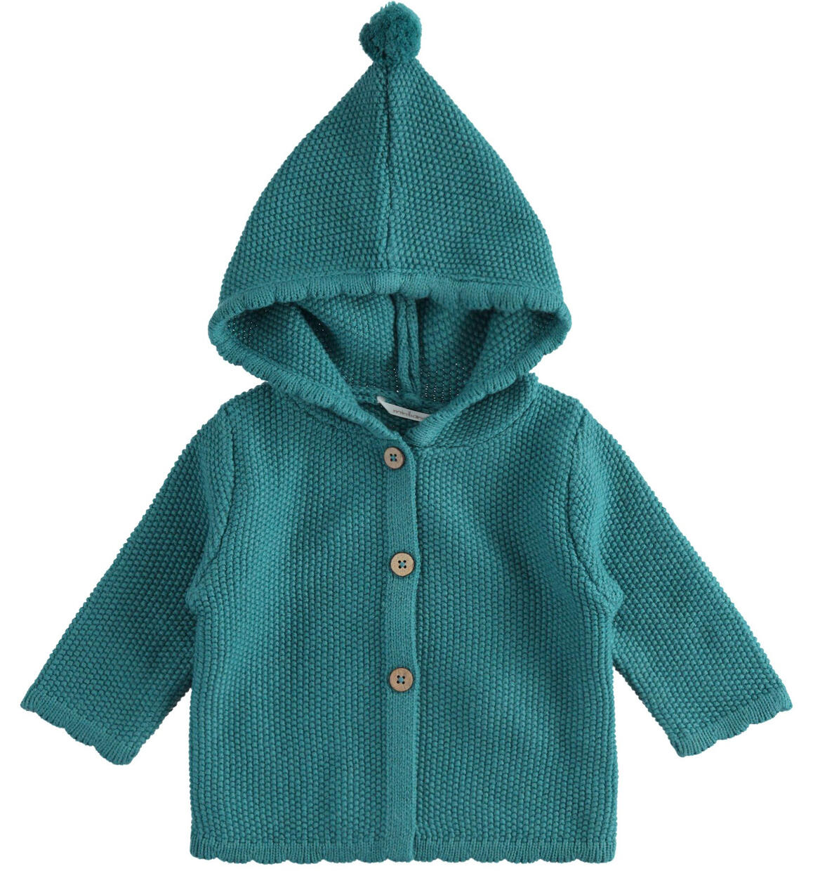 Felpa bimba Minibanda realizzata in tricot con particolare lavorazione. Il modello è arricchito da cappuccio e pompon. Apertura con bottoni