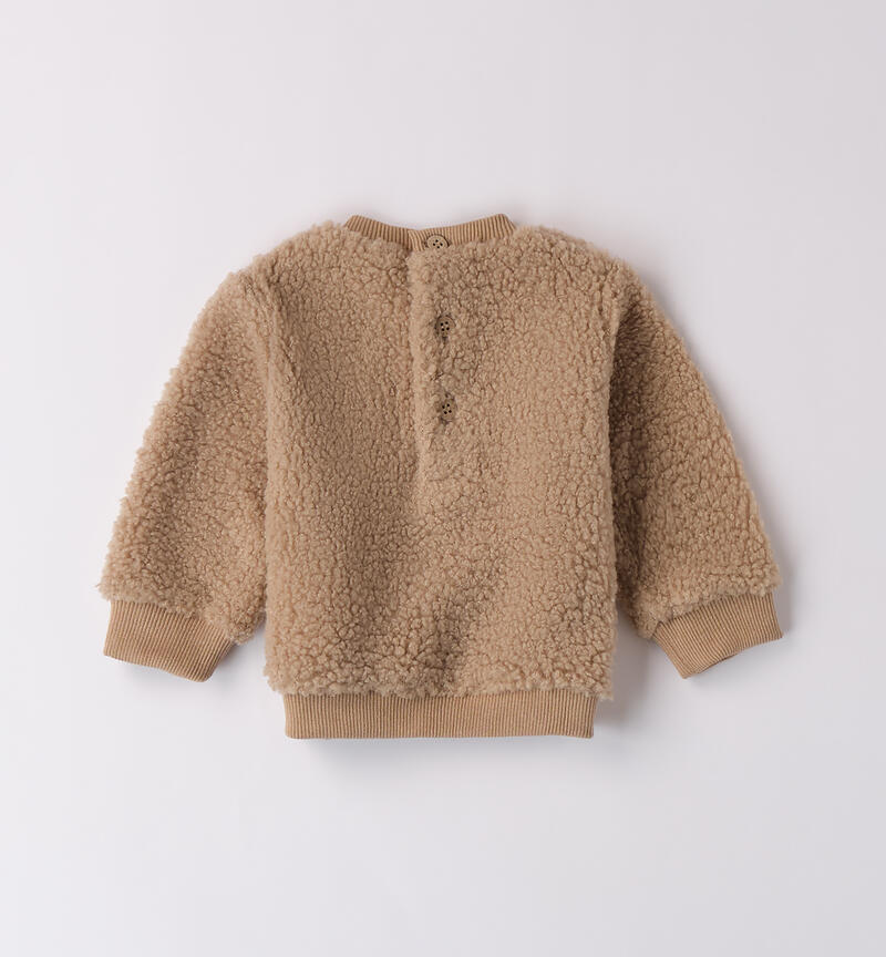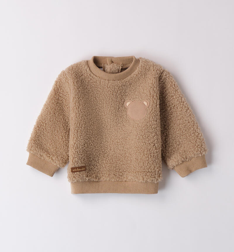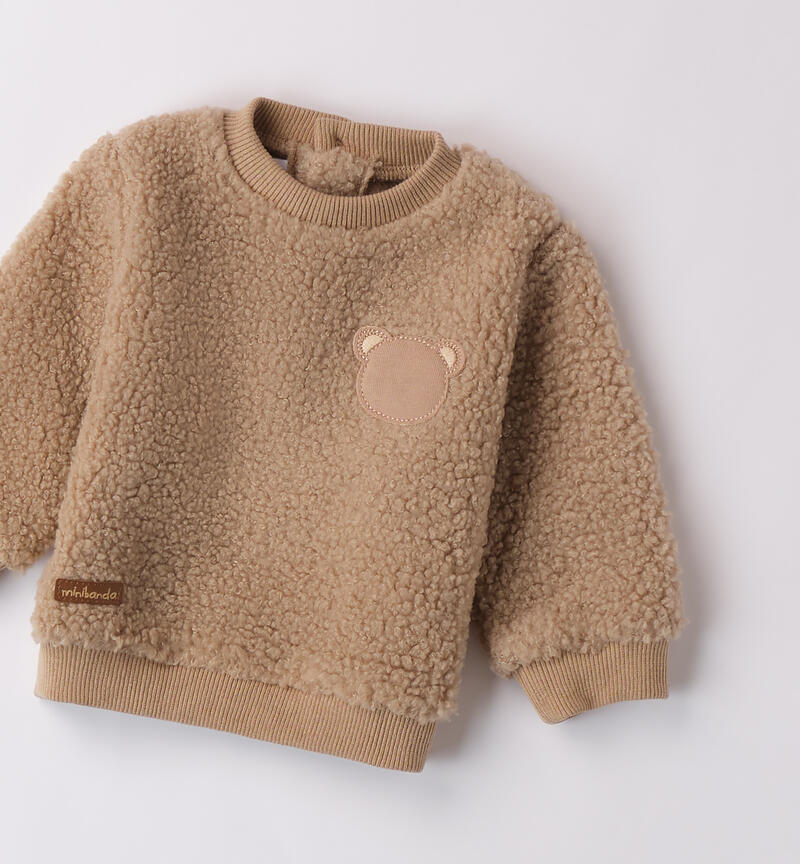 Felpa per bimbo Minibanda 1-24 mesi realizzata in tessuto teddy. Il modello presenta apertura sulla schiena con bottoni, fantasia tinta unita e fondo e polsini in costina. Patch orsetto in applicazione.
