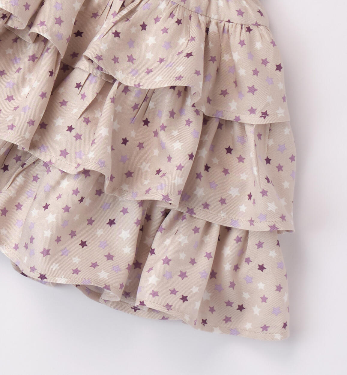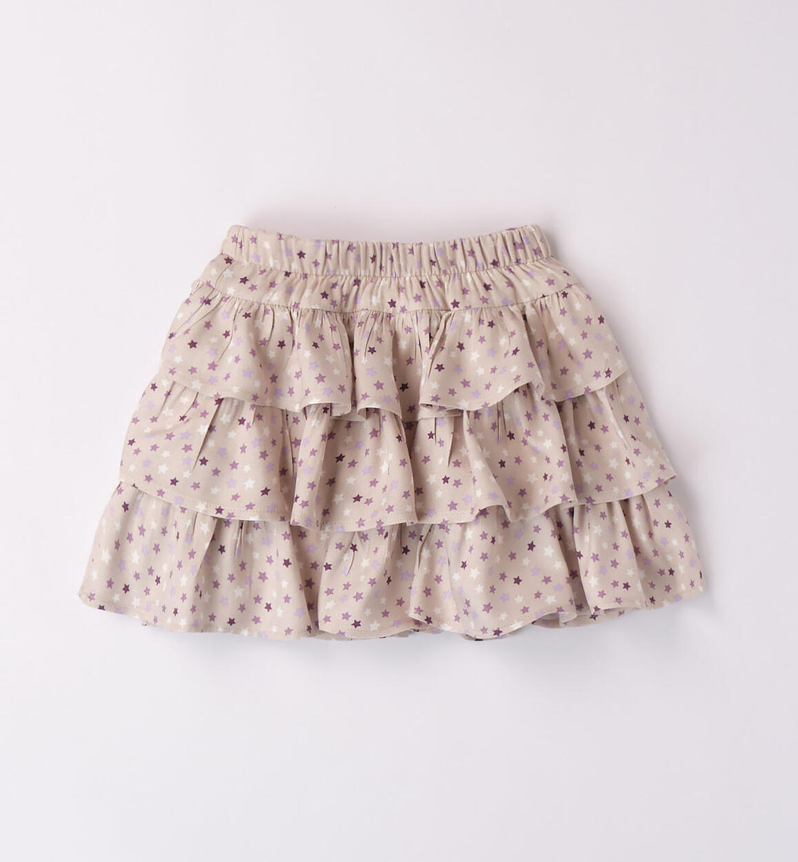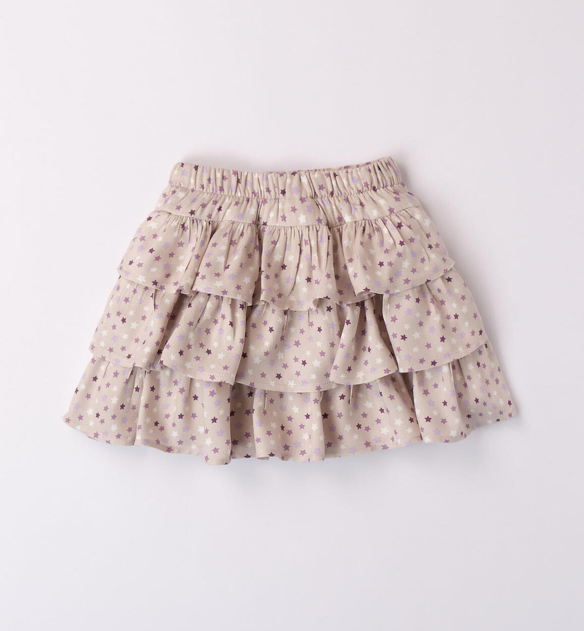 Gonna iDO per bambina, realizzata in twill viscosa a balze con stampa all over di stelle. Fodera in twill, vita elasticizzata e lunghezza sopra al ginocchio