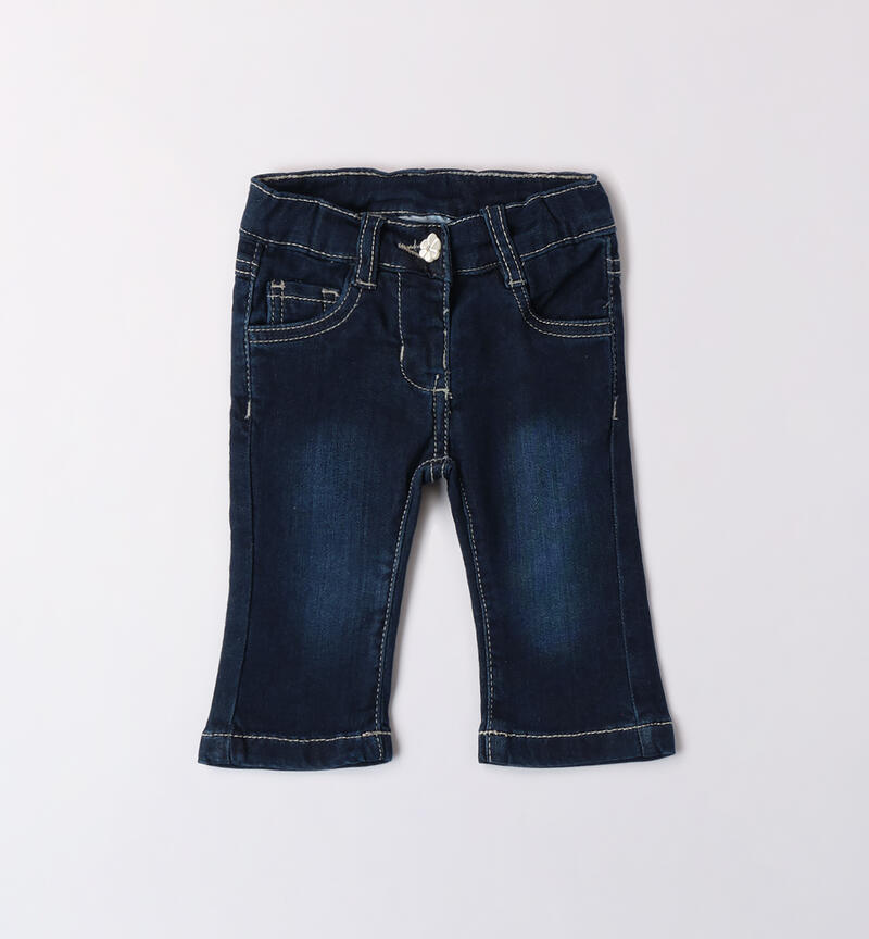 Jeans neonata Minibanda realizzato in denim maglia di cotone stretch. Il modello presenta chiusura con bottone a forma di fiore ed รจ arricchito da tasche. Modello a zampa. Vita regolabile con elastico asolato interno.