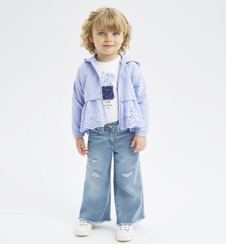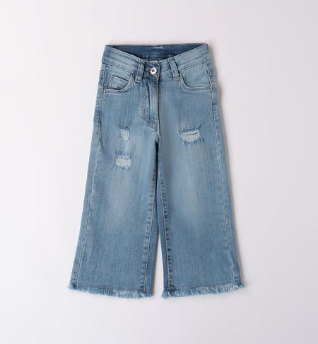 Pantalone di jeans per bambina iDO realizzato in denim stretch di cotone con rotture. Fondo sfrangiato e vestibilità ampia. Vita regolabile con elastico asolato interno. Apertura con zip e bottone.