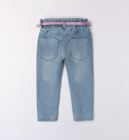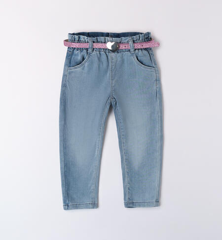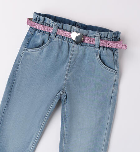 Jeans per bambina iDO 9 mesi – 8 anni realizzati in denim maglia di cotone stretch. Il pantalone presenta vita elasticizzata, tasche e risvoltini sul fondo. In abbinamento la cintura glitter con cuore e strass.