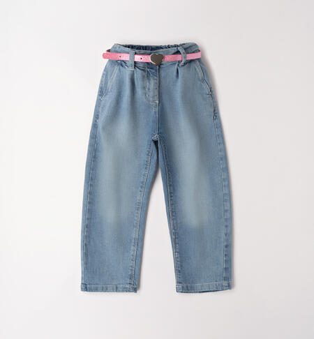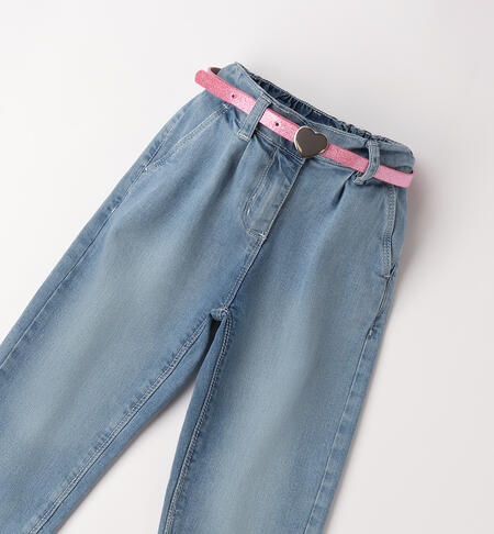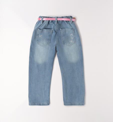 Pantalone lungo in denim stretch di cotone per bambina iDO con pinces. Apertura tramite zip e bottone. Vita regolabile con elastico asolato interno. Cintura in abbinamento.