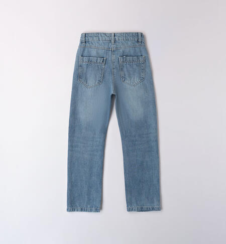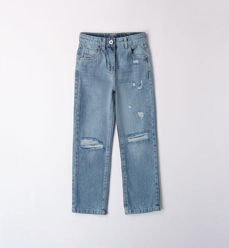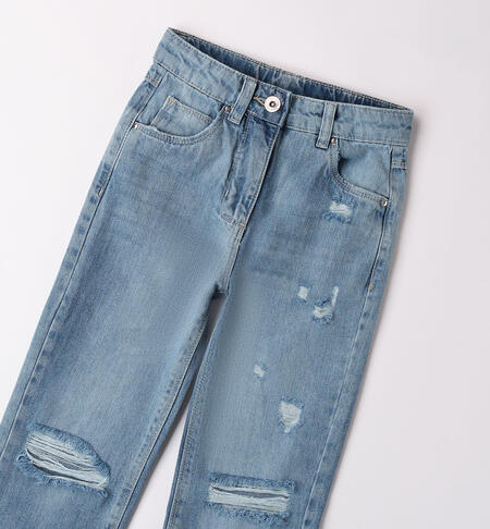 Jeans per ragazza iDO realizzato in denim 100% cotone con rotture. Vita regolabile con elastico asolato interno. Apertura con zip e bottone.