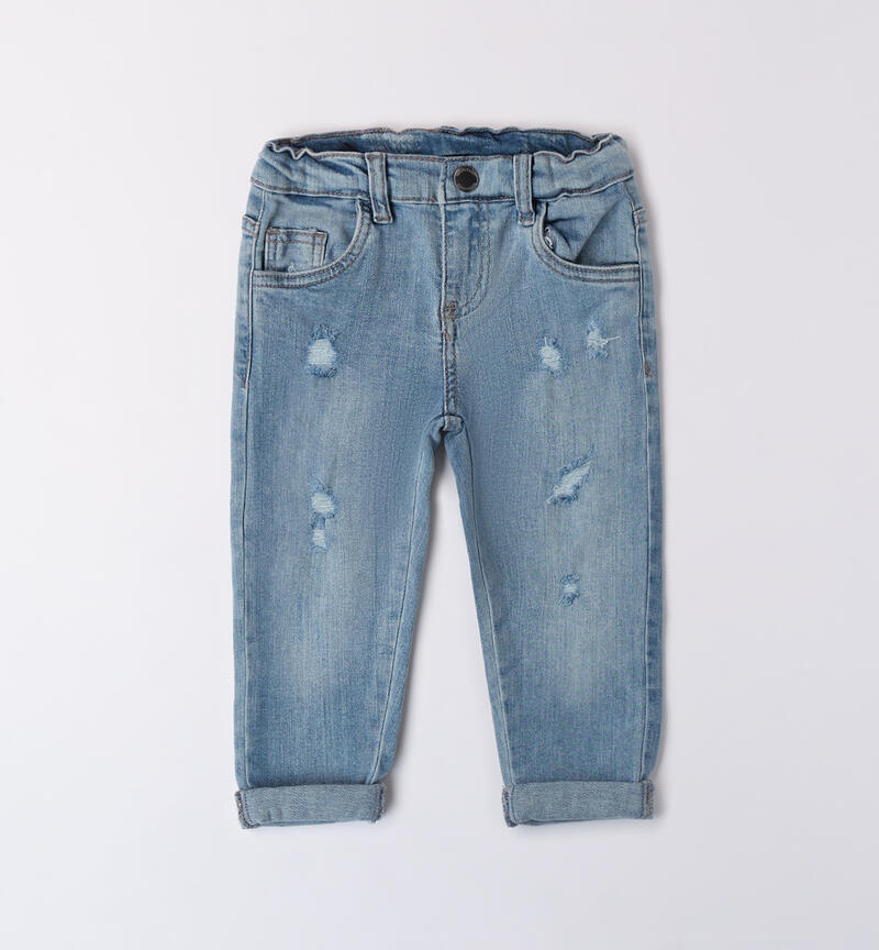Jeans per bambino Sarabanda 9 mesi – 8 anni in denim stretch. Il modello ha apertura con bottone e zip, tasche laterali e risvoltino sul fondo. Jeans strappato. Loose fit. Vita regolabile con elastico asolato interno.