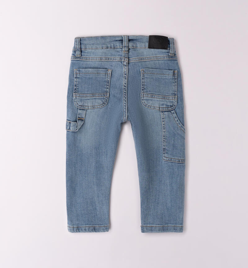 Jeans Sarabanda per bambino da 9 mesi a 8 anni realizzato in denim stretch di cotone. Il modello presenta apertura con zip e bottone, tasche e scritte. Vestibilitร carrot fit. Vita regolabile con elastico asolato interno