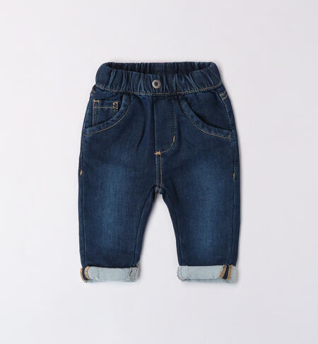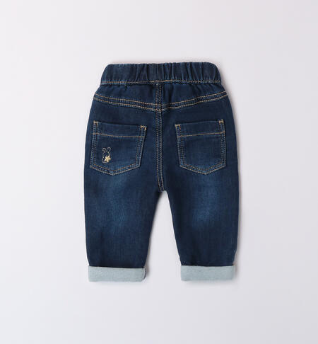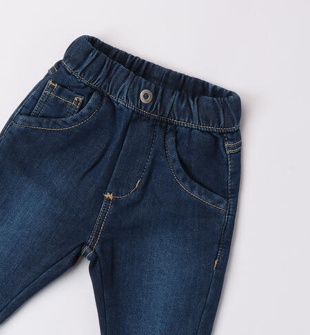 Jeans per bimbo iDO 9-24 mesi realizzati in denim maglia di cotone stretch. Il modello presenta vita elasticizzata con bottoni, tasche laterali e risvoltino sul fondo.