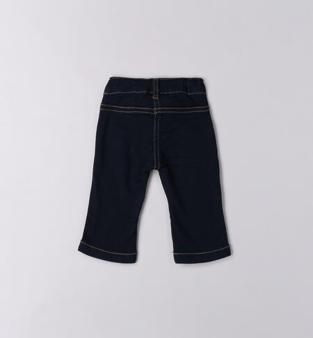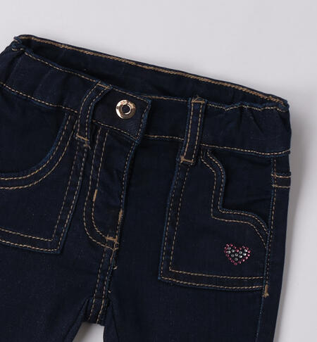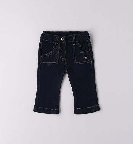 Jeans per bimba iDO 1-24 mesi realizzati in denim maglia di cotone stretch. Il modello presenta vita regolabile con elastico asolato interno e gamba ampia a zampa.