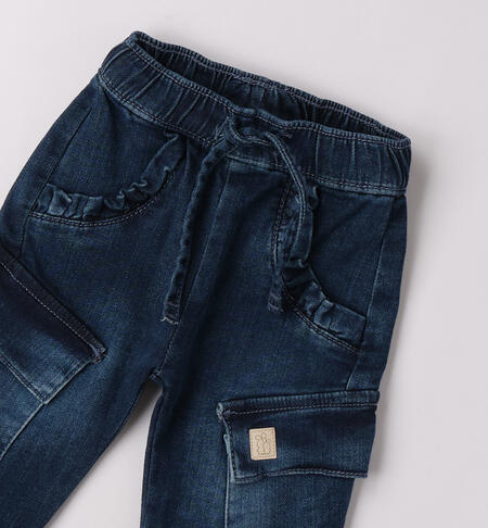 Jeans per bimba iDO 1-24 mesi realizzati in denim maglia di cotone stretch. Il modello presenta vita regolabile con elastico asolato interno, tasche laterali e ruches.