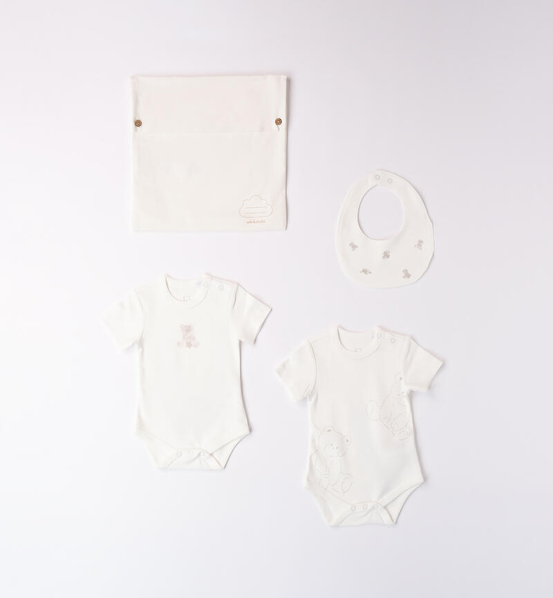 Kit composto da due body e bavetta modello unisex, realizzato in interlock 100% cotone. In abbinamento grazioso sacchetto in canvas. Perfetto come idea regalo per accogliere i nuovi arrivati.