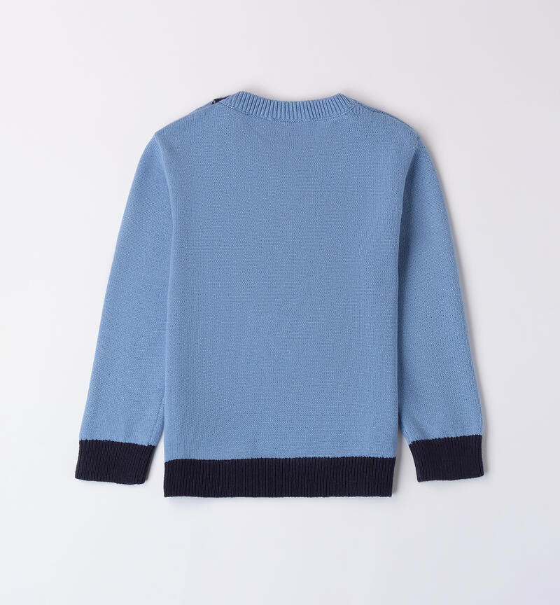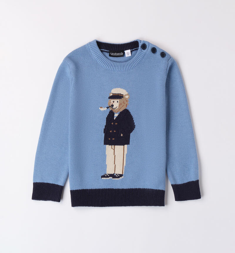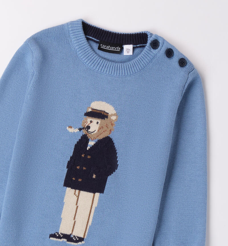 Maglia bambino Sarabanda 9 mesi – 8 anni realizzata in tricot. Il modello presenta apertura sulla spalla con bottoni a pressione, fantasia tinta unita con orsetto e polsini sul fondo e sulle maniche