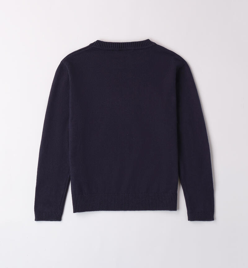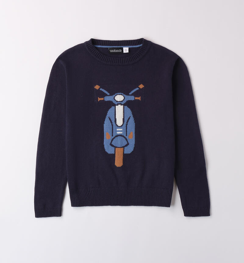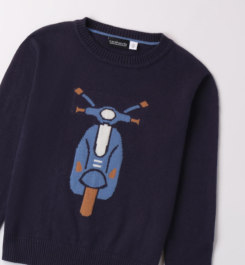 Maglia bambino Sarabanda realizzata in tricot. Il modello presenta apertura sulla spalla con bottoni a pressione, ricamo intarsio frontale, fantasia tinta unita.