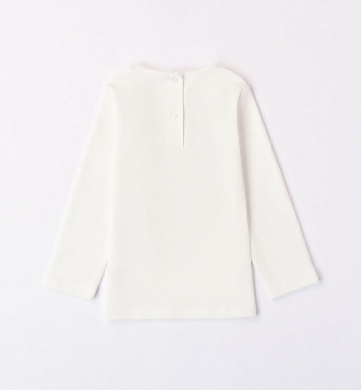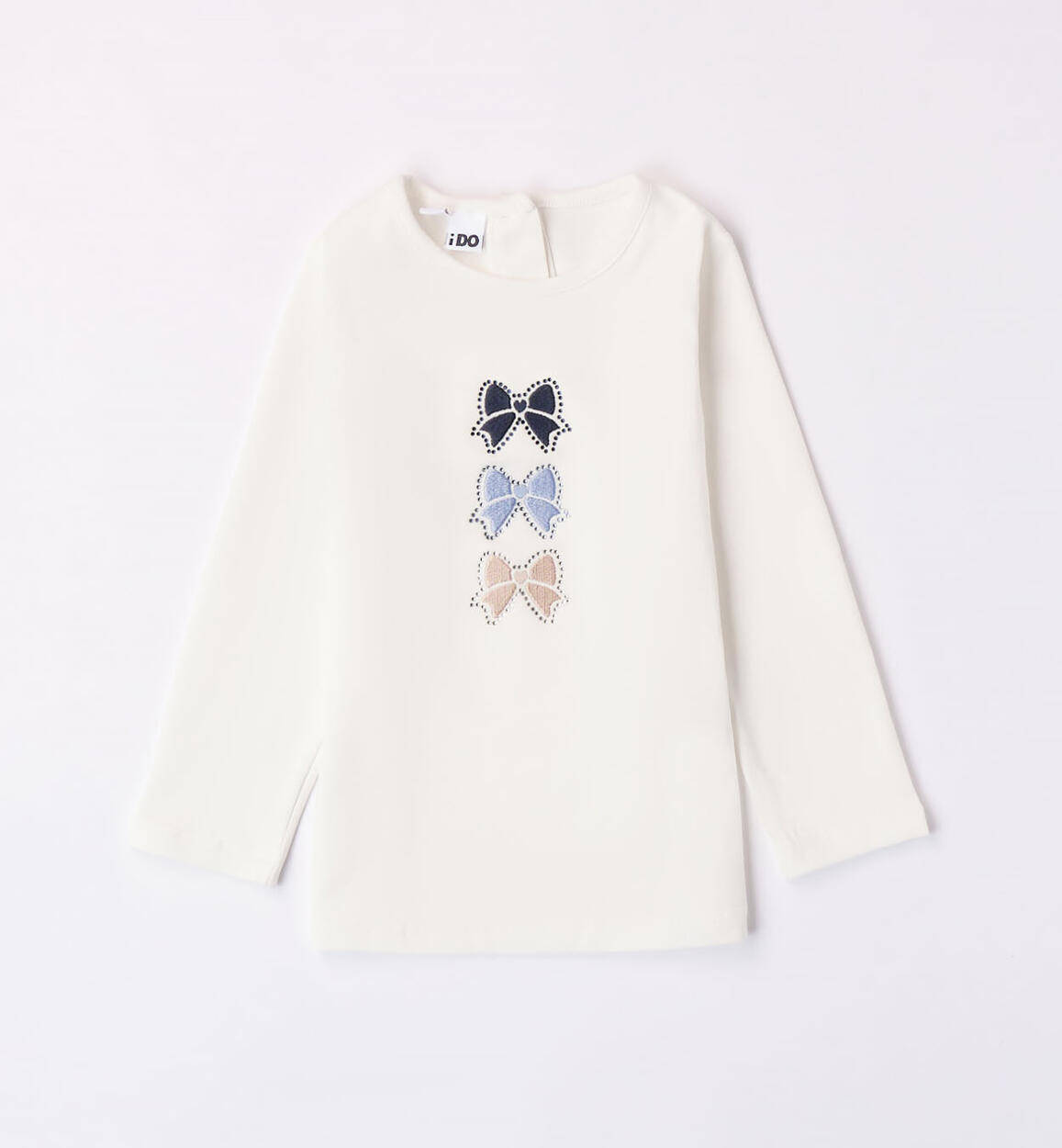 Maglietta iDO per bambina realizzata in jersey stretch di cotone mano pesca, con fiocchi e strass.