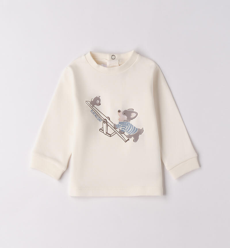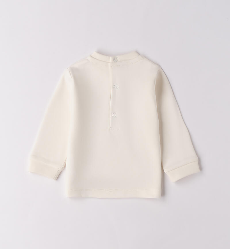 Maglietta per bimbo Minibanda 1-24 mesi realizzata in interlock 100% cotone. Il modello presenta apertura sul retro con bottoni a pressione per agevolare il cambio e la vestizione. Davanti รจ arricchita da simpatico ricamo