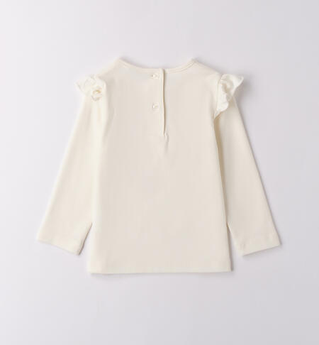 Maglietta per bambina iDO 24 mesi – 8 anni realizzata in jersey stretch di cotone manopesca. La maglietta è in tinta unita con ruches sulle spalle, ricamo di paillettes e fiorellini in applicazione.