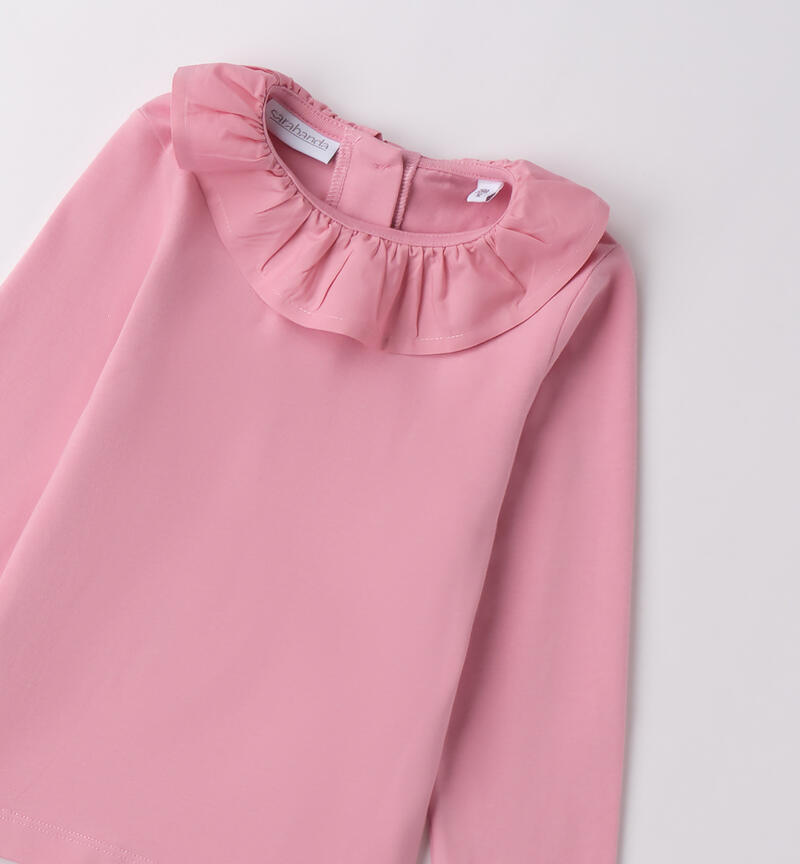 Maglietta bambina Sarabanda realizzata in jersey stretch di caldo cotone, manopesca. Colletto a corolla in popeline.