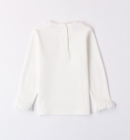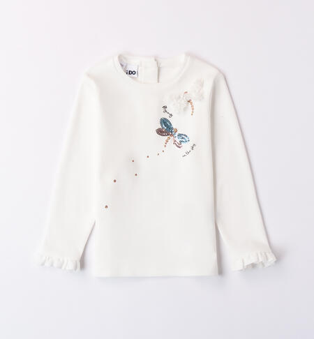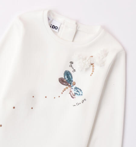 Maglietta per bambina iDO 12 mesi – 8 anni realizzata in interlock 100% cotone. Il modello presenta maniche con ruches in arricchimento. La maglietta รจ in fantasia tinta unita con stampa dai dettagli glitter e applicazione di paillettes.