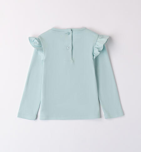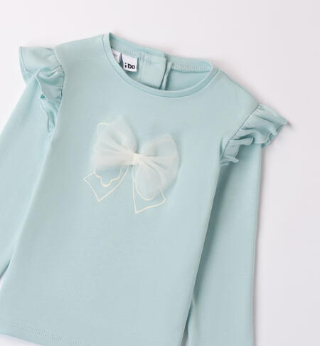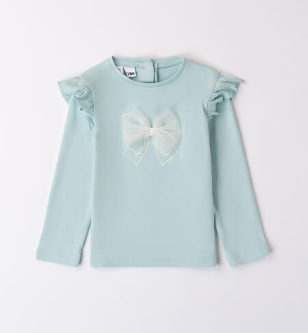 Maglietta per bambina iDO realizzata in interlock 100% cotone. La maglietta è in tinta unita con fiocco di tulle in applicazione. Ruches sulle spalle.