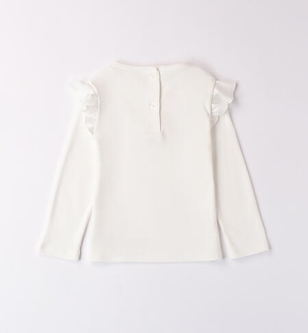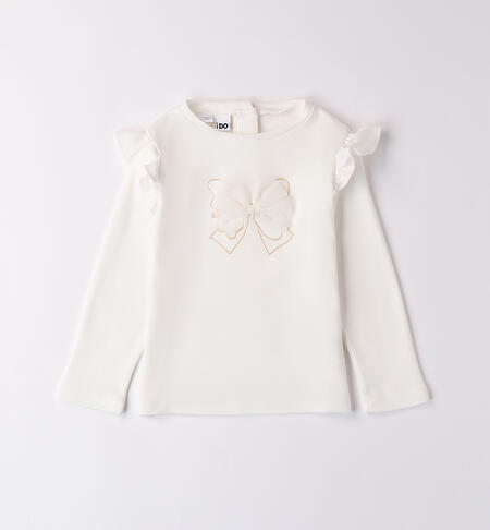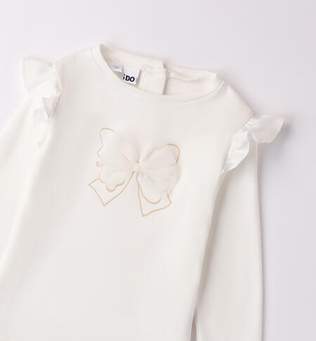 Maglietta per bambina iDO realizzata in interlock 100% cotone. La maglietta è in tinta unita con fiocco di tulle in applicazione. Ruches sulle spalle.