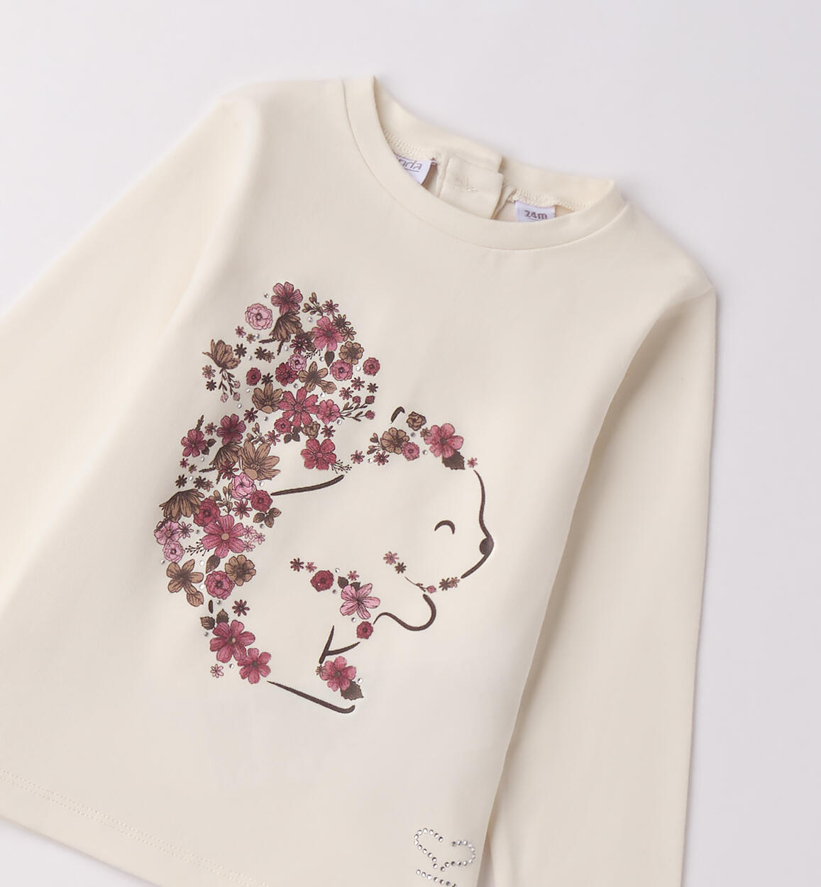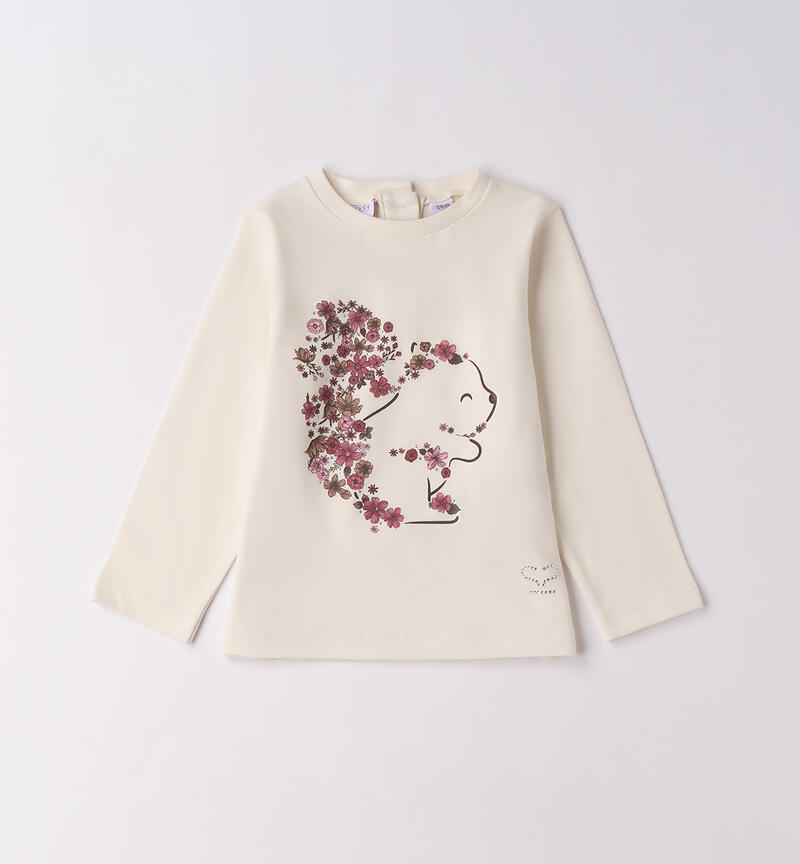 Maglietta bambina Sarabanda realizzata in jersey stretch di cotone, manopesca. Il modello ha stampa con strass
