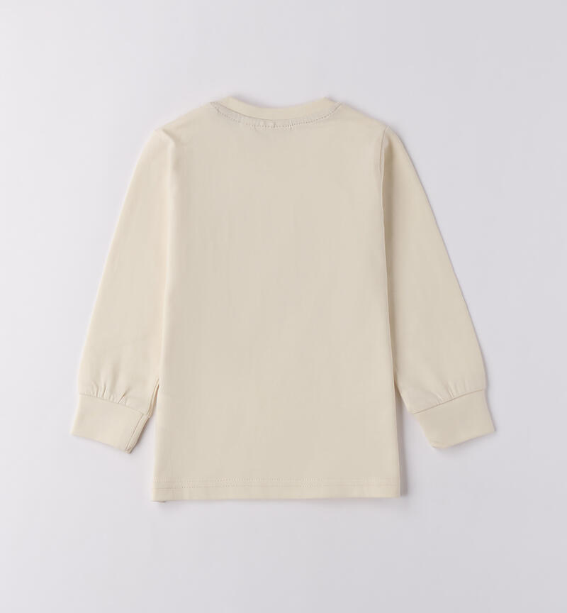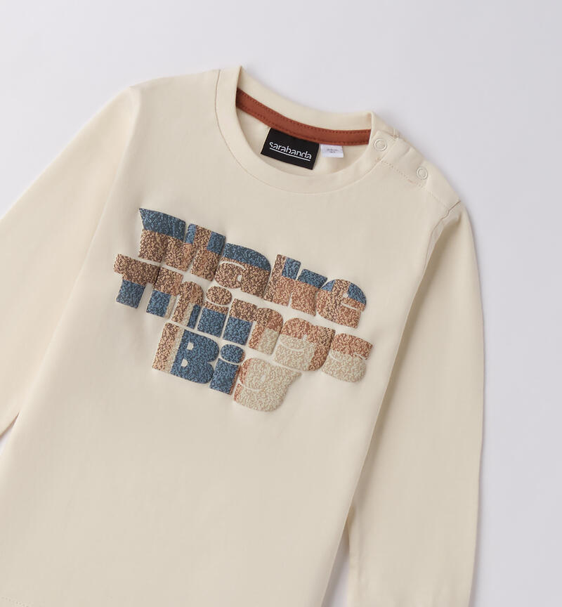 Maglietta per bambino Sarabanda 9 mesi – 8 anni realizzata in jersey 100% cotone manopesca. Il modello presenta apertura sulla spalla con bottoni a pressione fino alla taglia 3 anni. Davanti รจ arricchita da stampa a rilievo
