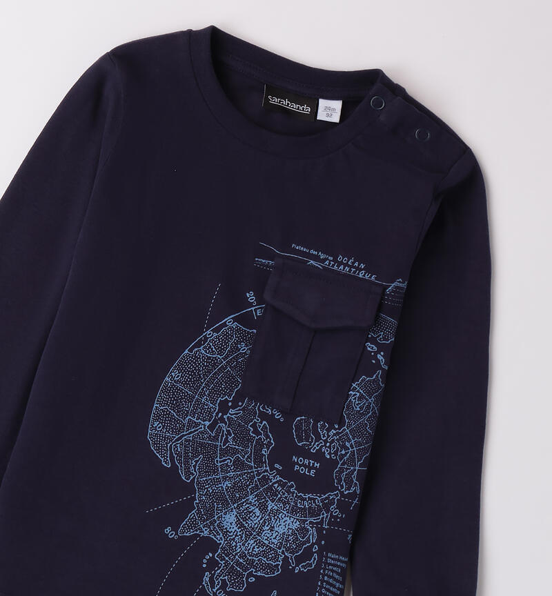 Maglietta per bambino Sarabanda 9 mesi – 8 anni realizzata in jersey 100% cotone, mano pesca. Il modello presenta apertura sulla spalla con bottoni a pressione. La maglietta ha polsini sulle maniche e fantasia tinta unita con taschino e stampa.
