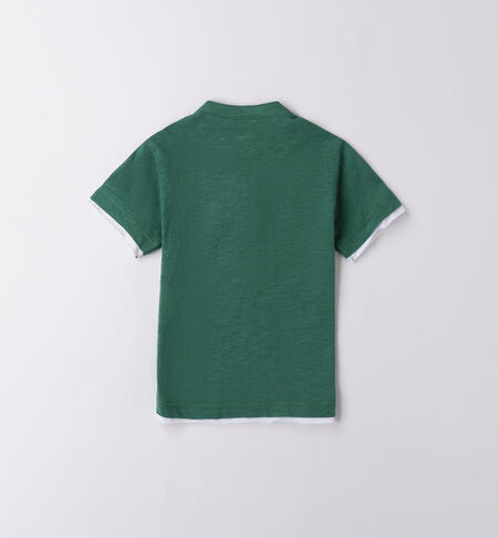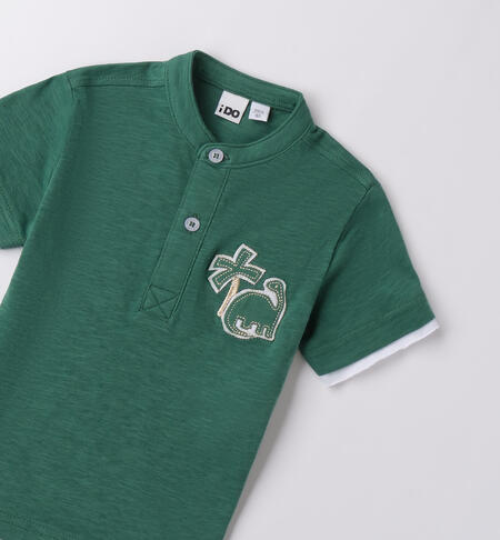 T-shirt per bambino iDO da 9 mesi a 8 anni realizzata in jersey 100% cotone. Il modello presenta apertura frontale con bottoni, fantasia tinta unita con stampa frontale. Modello polo serafino