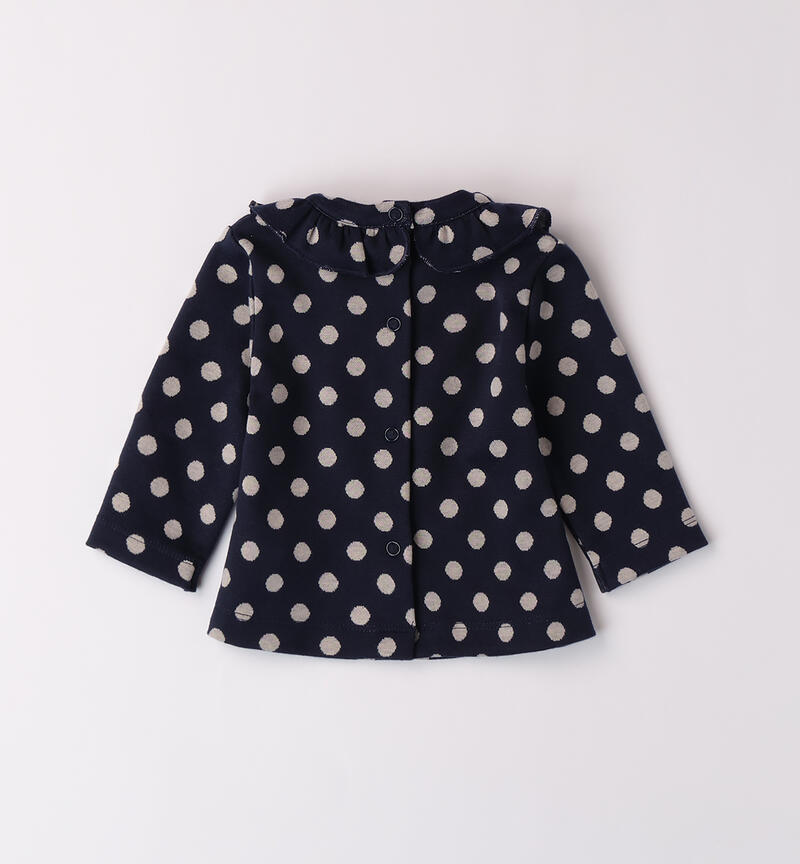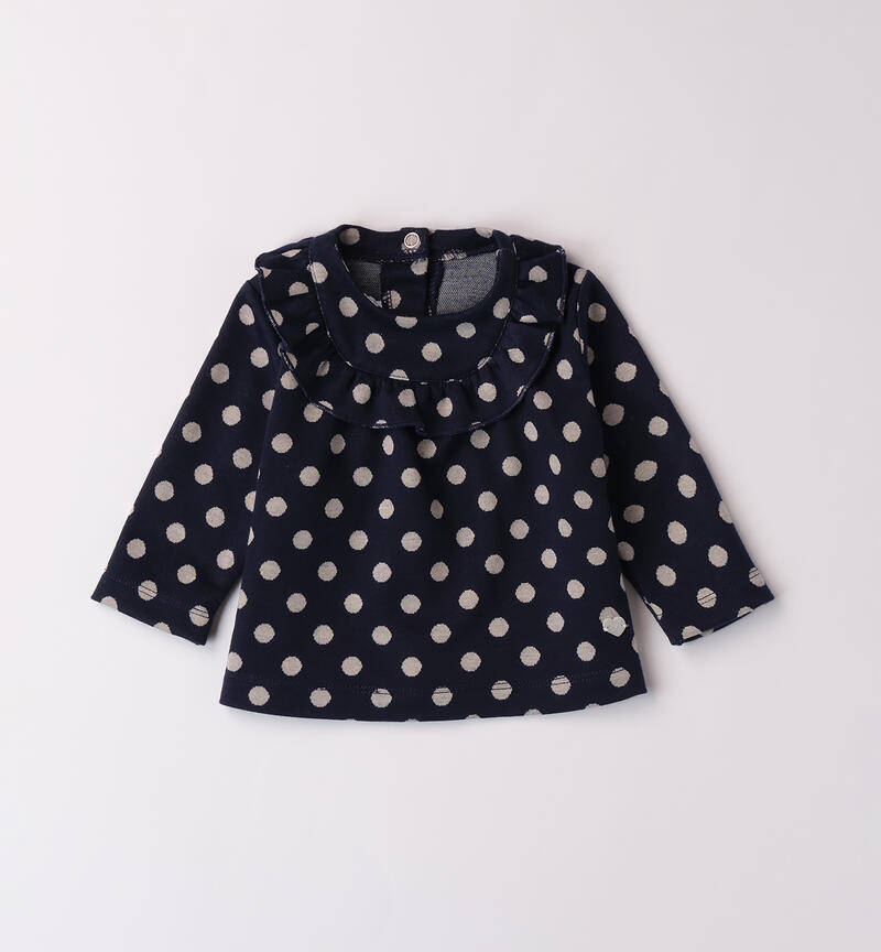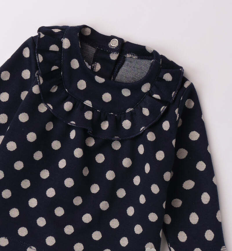 Maglia per bimba Minibanda 1-24 mesi realizzata in morbido tessuto jaquard. Il modello presenta apertura sul retro con bottoni a pressione per agevolare il cambio e la vestizione. L’articolo รจ realizzato in fantasia a pois ed รจ arricchito da ruches