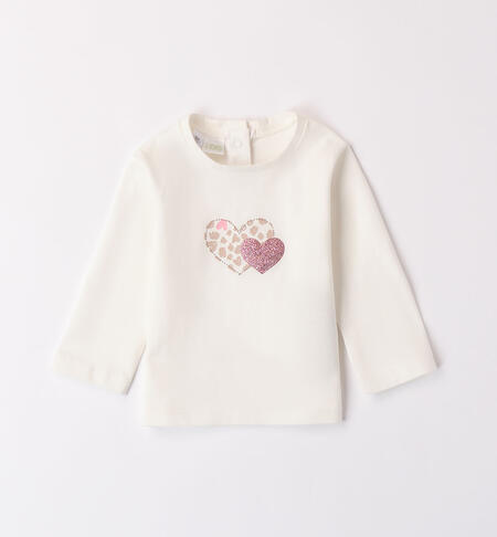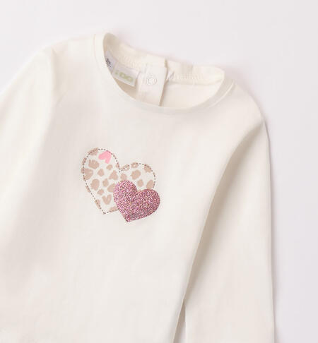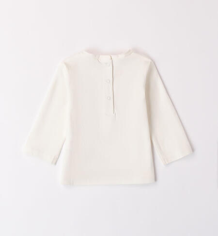 Maglietta girocollo iDO per bimba in jersey 100% cotone. Il modello presenta apertura sulla schiena con bottoni a pressione per agevolare il cambio e la vestizione. La maglietta รจ realizzata in fantasia tinta unita con stampa e dettagli glitter.