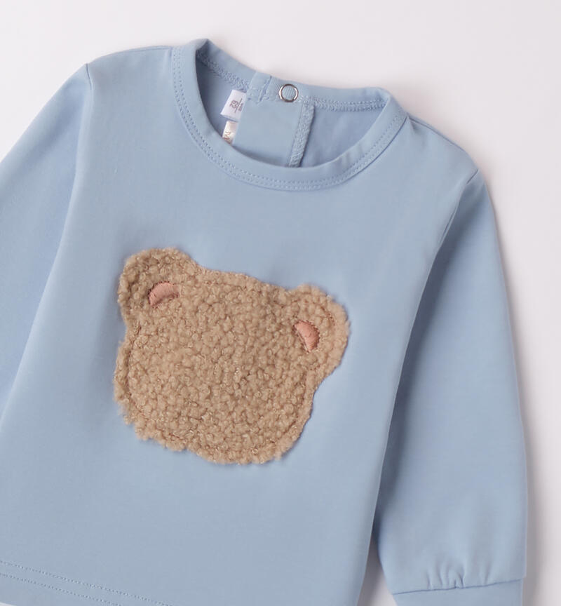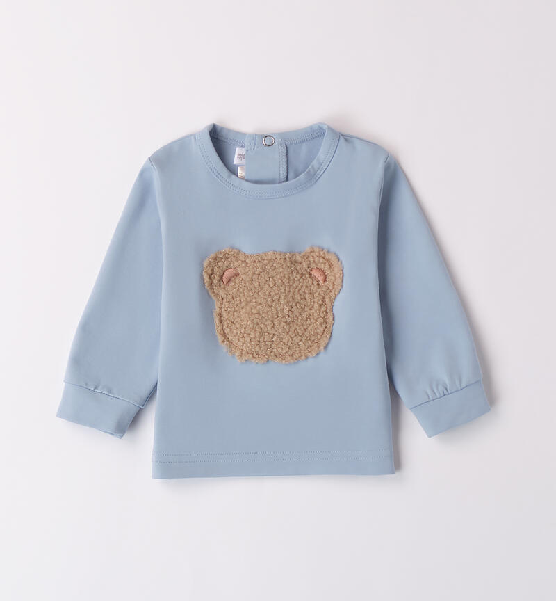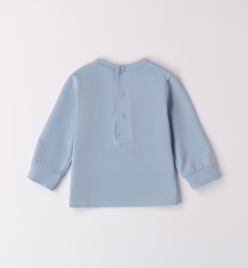 Maglietta per bimbo Minibanda 1-24 mesi realizzata in jersey stretch di cotone, mano pesca. Il modello presenta apertura dietro con bottoni a pressione per agevolare il cambio e la vestizione. La maglietta รจ realizzata in fantasia tinta unita con ricamo di orso frontale.