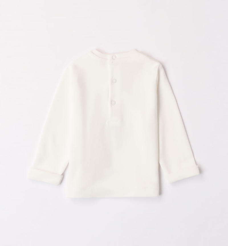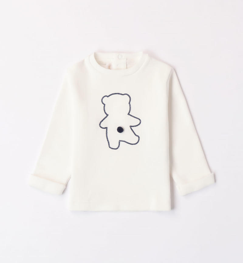 Maglietta girocollo Minibanda per bimbo realizzata in interlock 100% cotone con ricamo orsetto e applicazione pompon. Risvoltino sul fondo manica e apertura dietro la schiena con bottoni snap