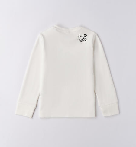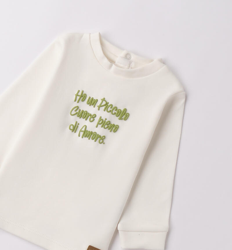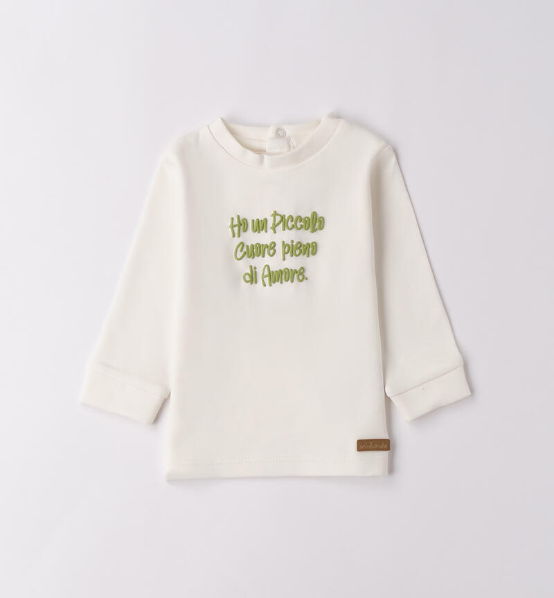 Maglietta per bimbo Minibanda realizzata in interlock 100% cotone. Il modello presenta apertura sul retro con bottoni a pressione per agevolare il cambio e la vestizione. Stampa a rilievo davanti