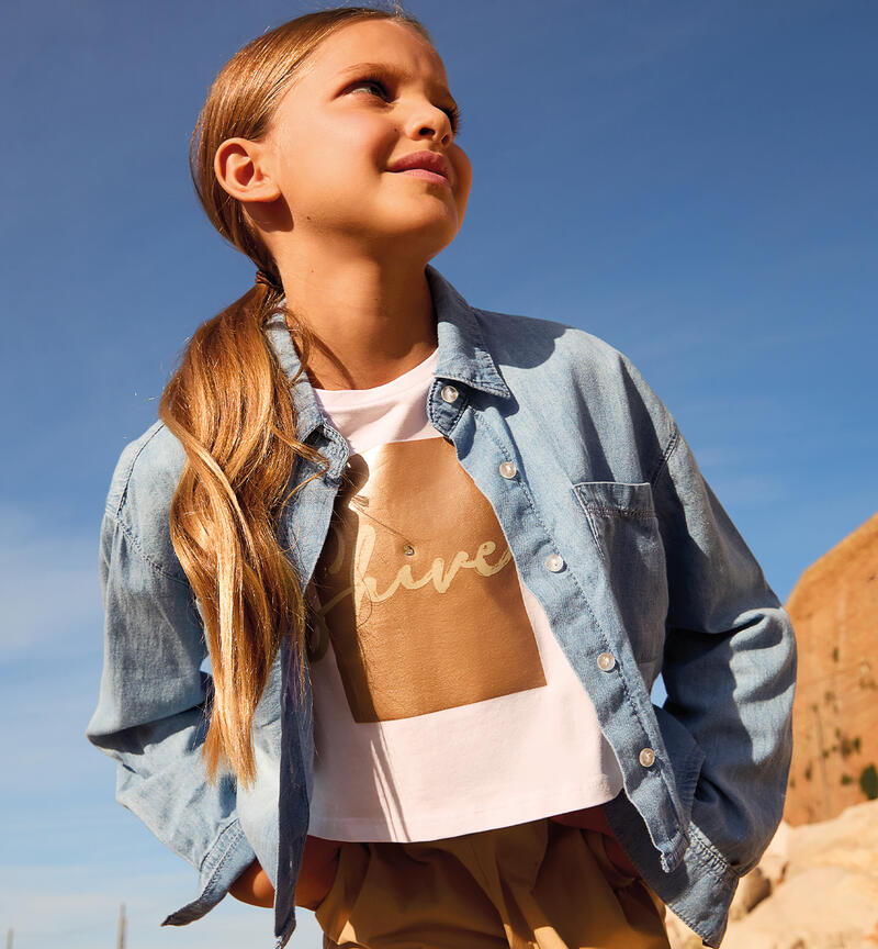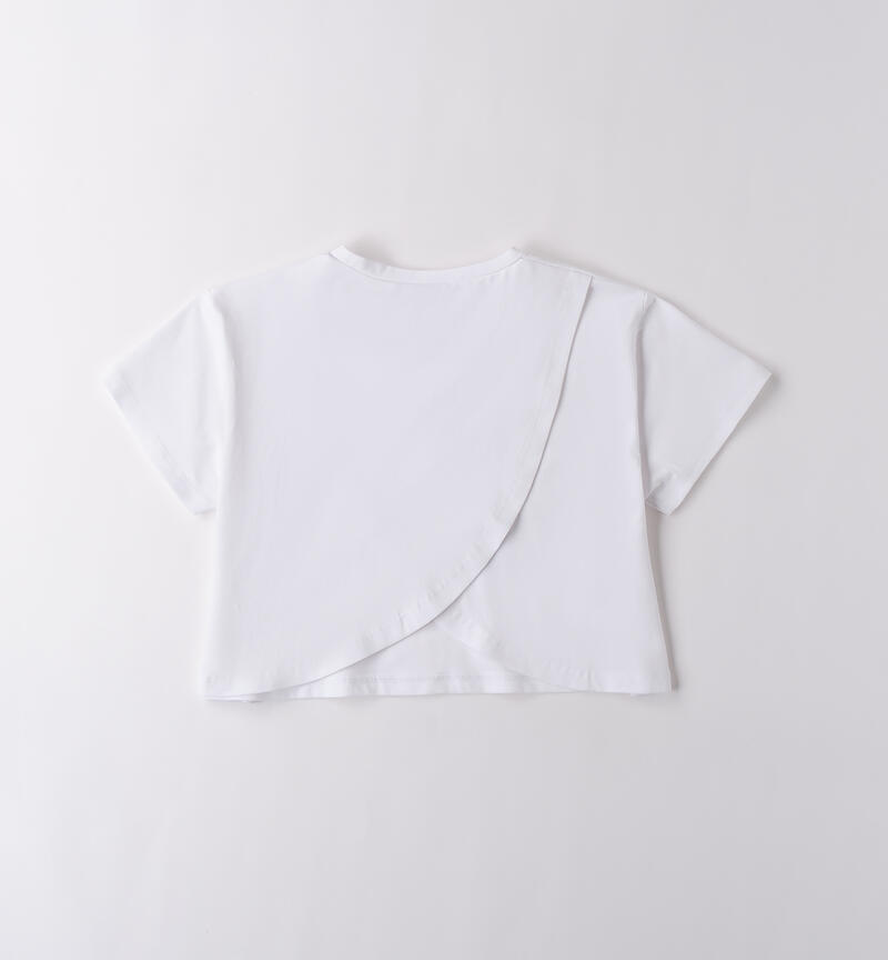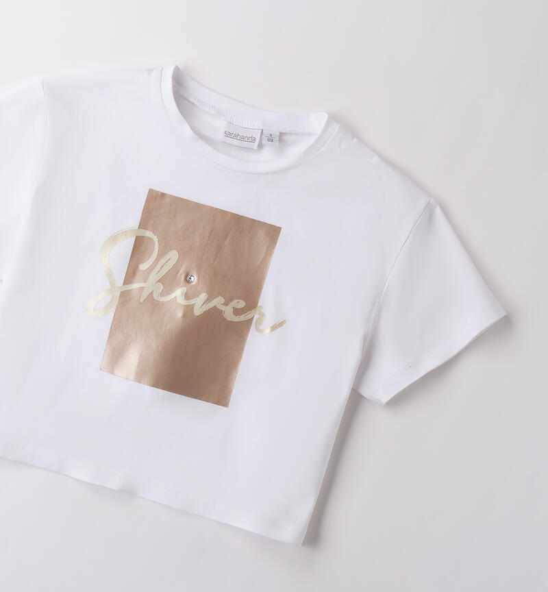 T-Shirt per ragazza Sarabanda 8-16 anni realizzata in jersey stretch di cotone. Il modello è in fantasia tinta unita con stampa frontale. Modello cropped.