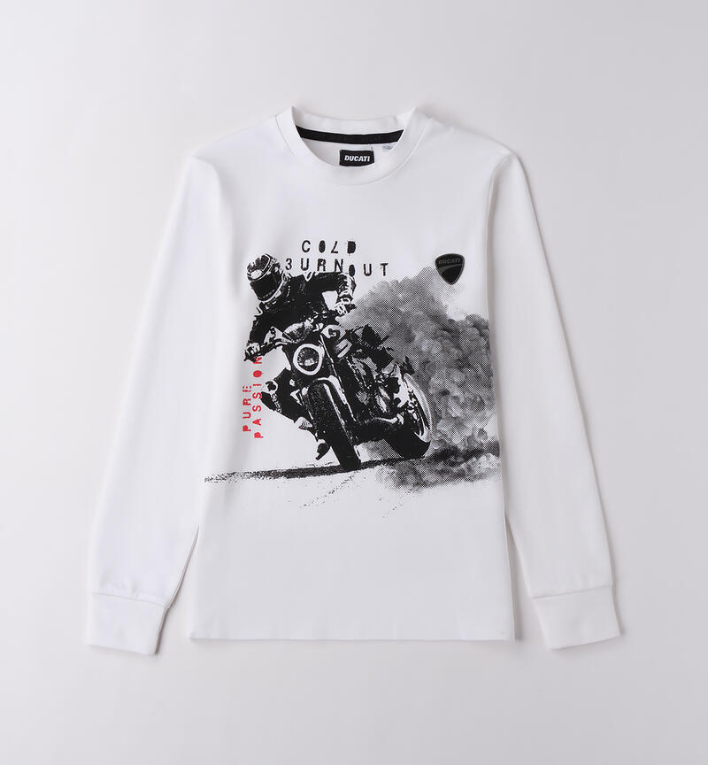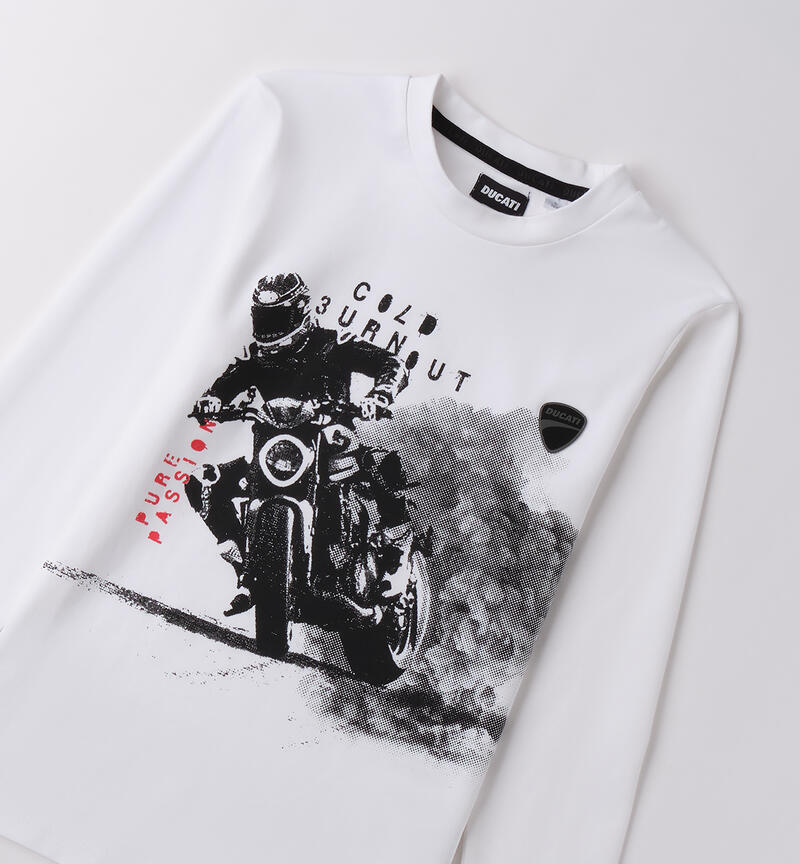Maglietta Ducati per ragazzo 3-16 anni realizzata in interlock 100% cotone. Il modello, girocollo, è realizzato in fantasia tinta unita con stampa davanti e badge Ducati in applicazione.