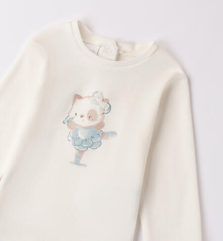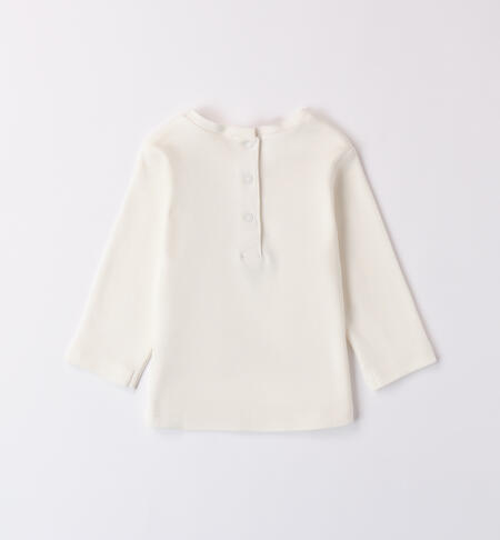 Maglia per bimba iDO realizzata in interlock 100% cotone. Il modello presenta apertura sul retro con bottoni a pressione per agevolare il cambio e la vestizione. L’articolo รจ realizzato in fantasia tinta unita con stampa dolci ricci.
