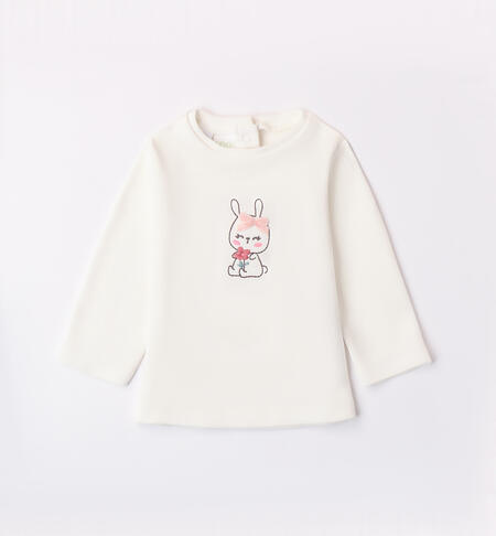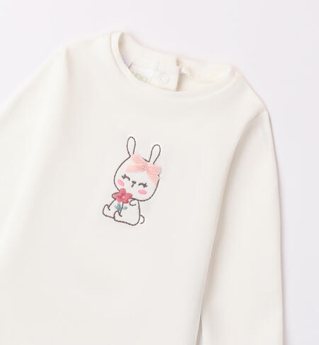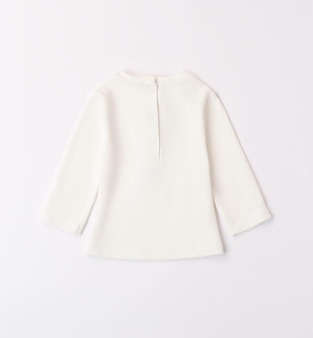 Maglia per bimba iDO realizzata in interlock 100% cotone. Il modello presenta apertura sul retro con bottoni a pressione per agevolare il cambio e la vestizione. L’articolo รจ realizzato in fantasia tinta unita con stampa dolci ricci.
